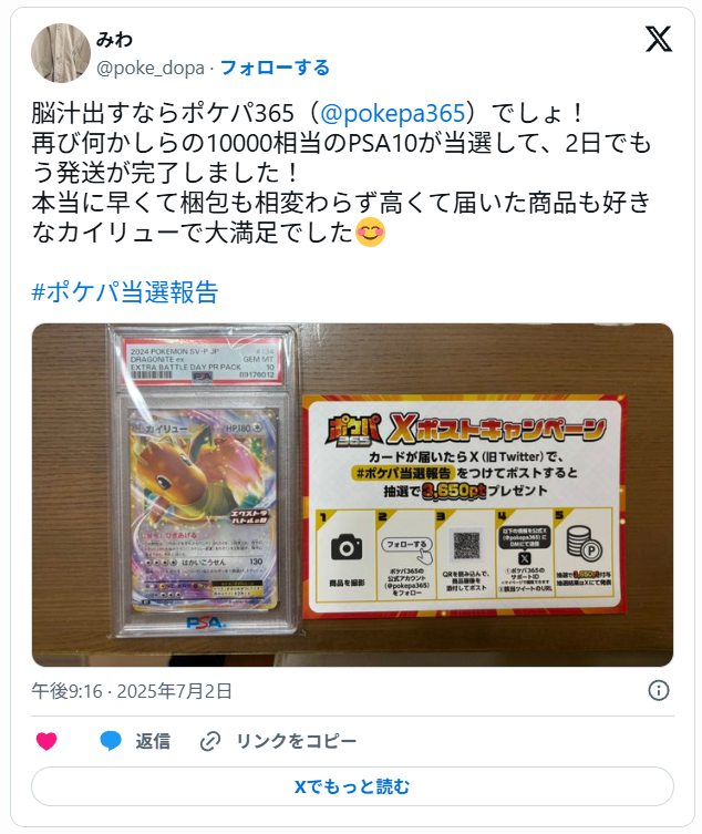 ポケパ365の評判で特に多いのが、「高額カードが当たった」という口コミです。